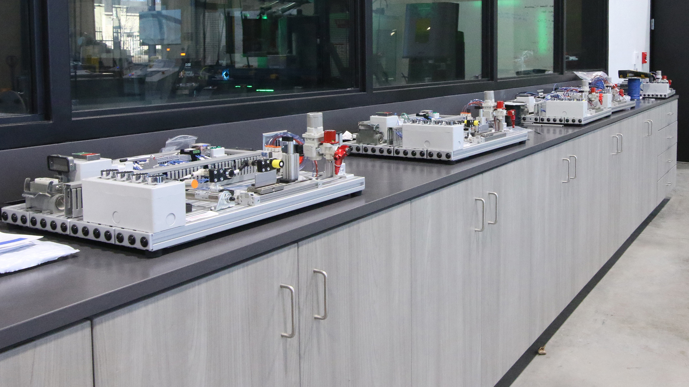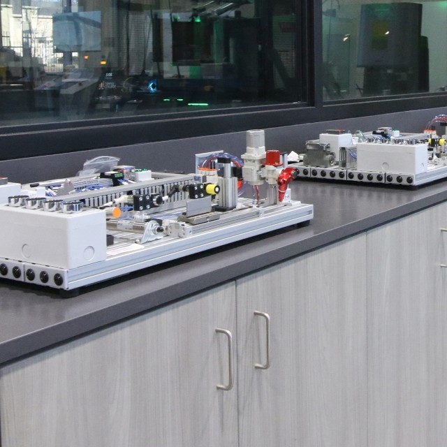 In the Workforce and Visual Arts Building, a feature walls and ceiling beams use Wilsonart River Cherry HPL, provide visual interest and warmth to the industrial space. These elements create distinctive, engaging spaces that define activity zones while maintaining design cohesion with other campus areas.