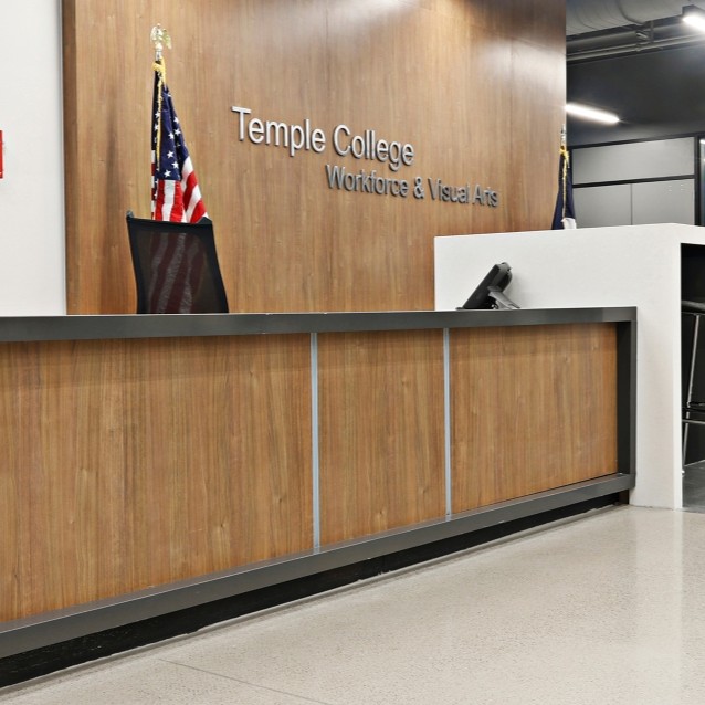 With more than 5,000 students on campus, Temple College required interiors that feel welcoming without compromising durability. Wilsonart surfaces offer durability and beauty while introducing warmth and biophilic character—supporting student comfort while withstanding the realities of high-traffic academic environments. Material continuity across lounges, corridors, and shared spaces in the Workforce & Visual Arts Building, and the college’s Main Building helped unify distinct buildings under a consistent visual language.