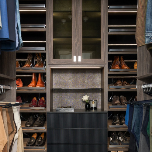 In addition to LUJO panels, Closet Envy relies on Thinscape for countertops, cabinet tops, and wall backings. Its ultra-thin profile, dynamic designs, and durability make it stand out in closet environments. “We all love Thinscape. I use it everywhere,” says Renson. “It’s not heavy, doesn’t chip, and it looks extremely high-end.”